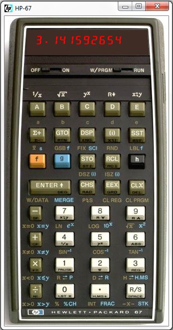 HP-67 Emulator NEW ! This emulation of the famous HP-67 calculator is running under Windows XP/7/8/10. It executes the original HP-67 microcode. Therefore every calculation is performed exactly identical as if using a real HP-67. It contains every function of the original calculator. Of course there is no card reader on a computers desktop. But you can save and load your programs and registers to/from file.