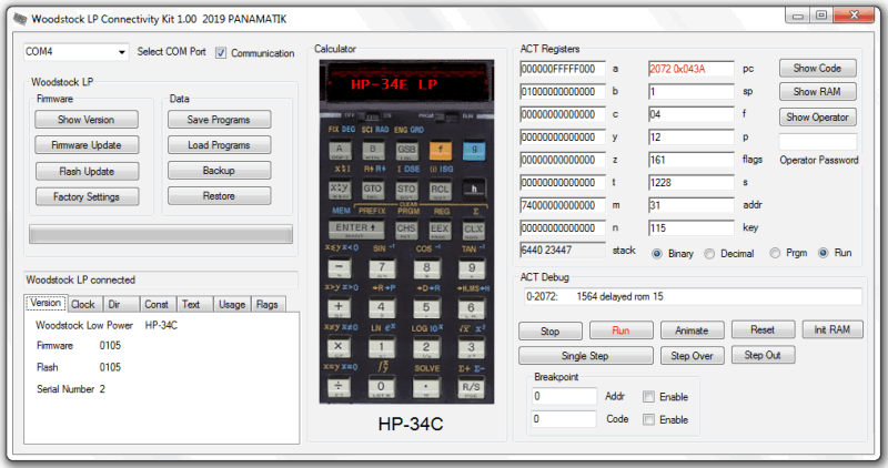 1.) Shows mathematical functions and program steps as plain text. 2.) Integrated accurate Real Time Clock with date, time, alarm time, weekday and stopwatch. 3.) Replaces the complete electronics of the original calculator including the power supply. 4.) Infrared printing diode for HP82240B printer and alarm piezo buzzer included. 5.) Easy switching between all “Woodstock” models and many other models like HP-34C, HP-67. 6.) Separate workspace for all models, 110 programs and 10 register sets for programmables. 7.) All HP-25 Applications programs and HP-67 Standard Pac programs already built in. 8.) PC communication for upload/download programs and data. 9.) Can be placed into HP-21 HP-22 HP-25 HP-25C HP-27 and HP-29C hardware.