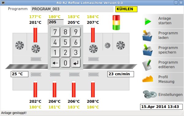 Die Modernisierung der Steuerung des Reflow Lötofens RO-R2 der Firma SEF Systec GmbH und die grafische Neugestaltung der Bedienoberfläche mit GTK+ wurde von PANAMATIK unter Verwendung von embedded LINUX auf einem ARM Cortex Prozessor realisiert. Sämtliche Bedienelemente und Grafiken wurden von Atelier Vassiliev neu entworfen. Die Bedienung erfolgt über Touchscreen oder von einem externen Tablet Computer über WLAN. |